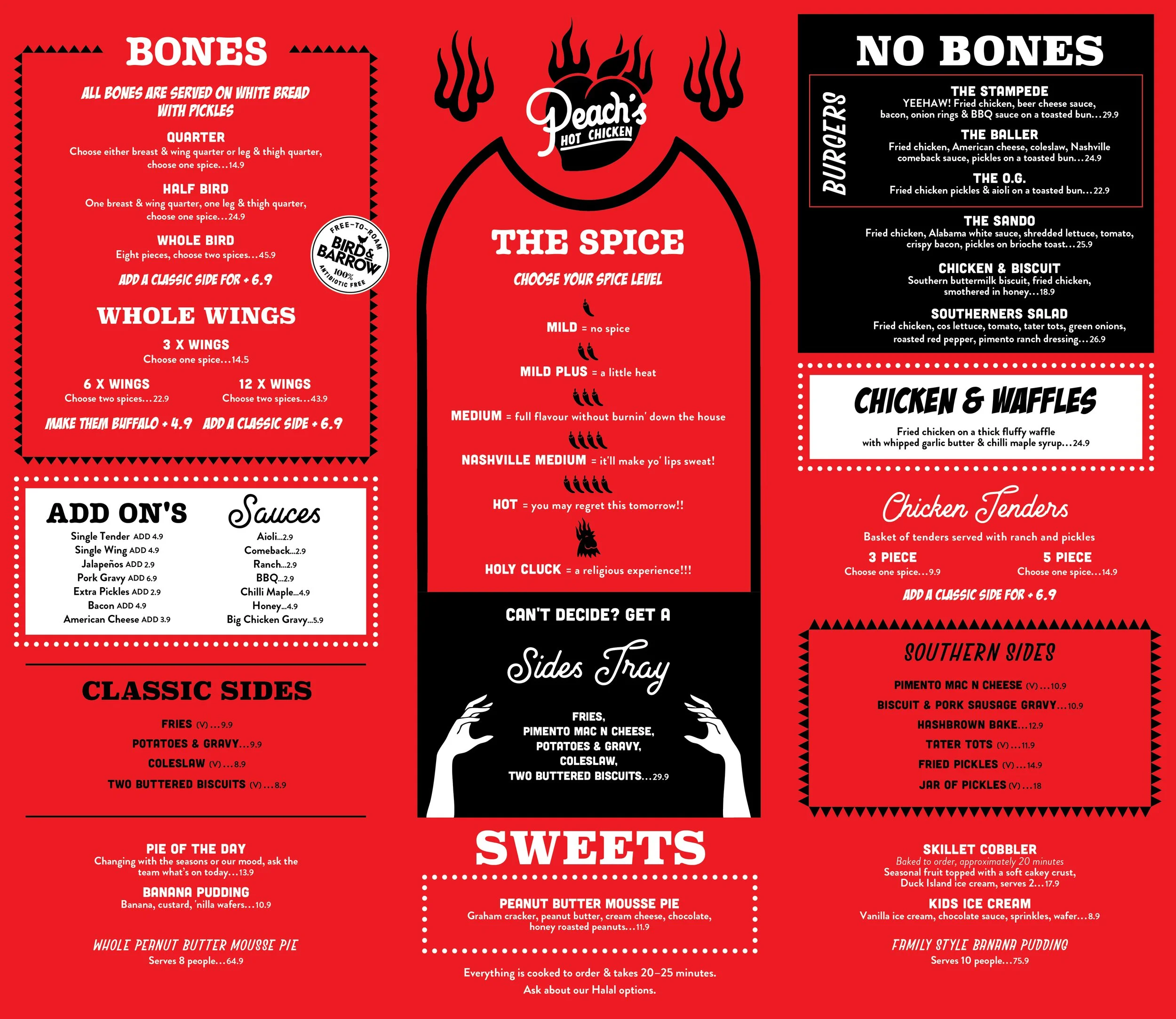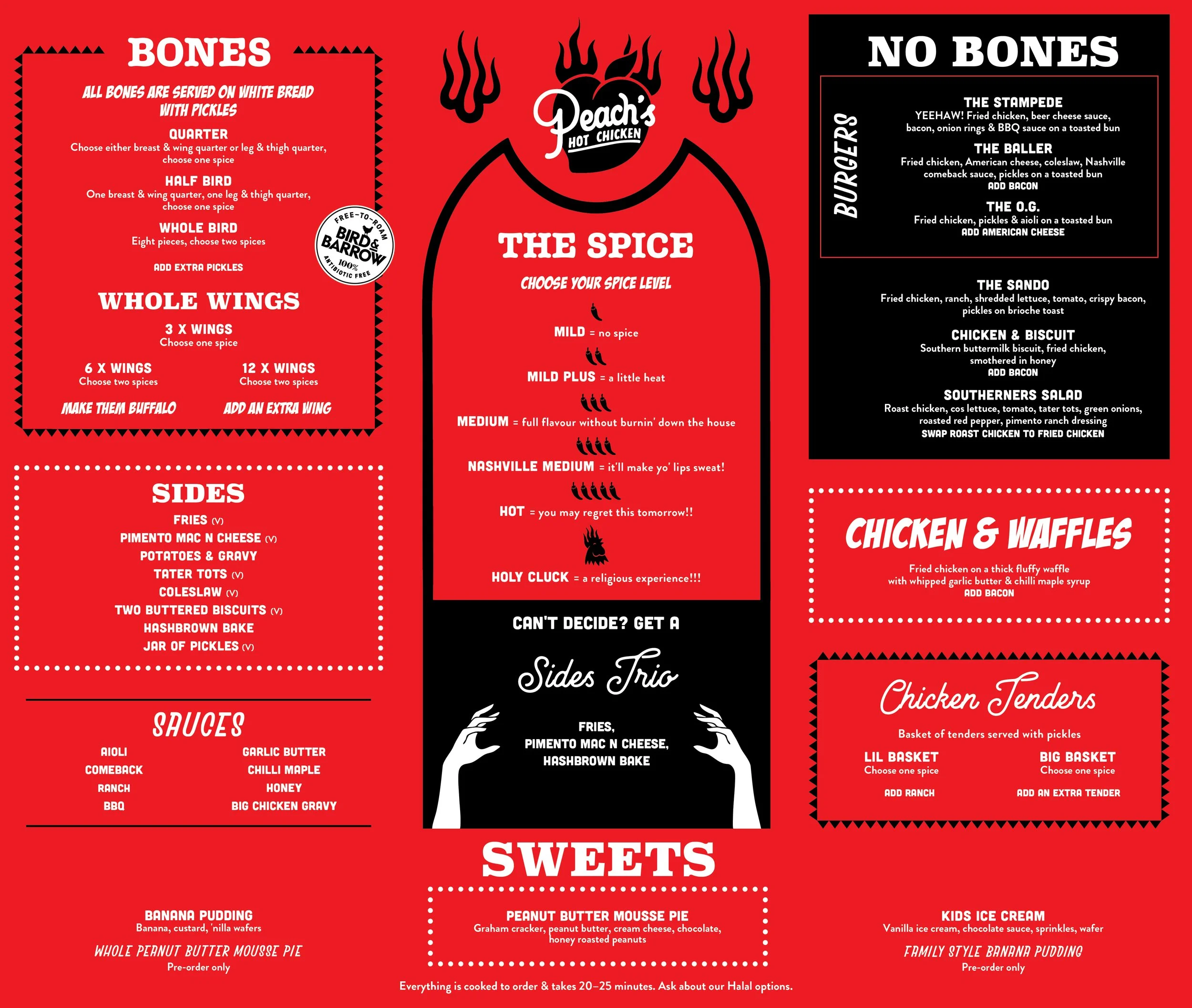 From the start, Peach’s has been about doing things right. All our chicken is free range, antibiotic-free, butchered daily by our talented team, and prepared fresh to order. Once you pick your spice level, you can have it served on classic white bread with pickles, in a soft toasted bun as a burger, atop fluffy Belgian waffles or even in a house-made biscuit.